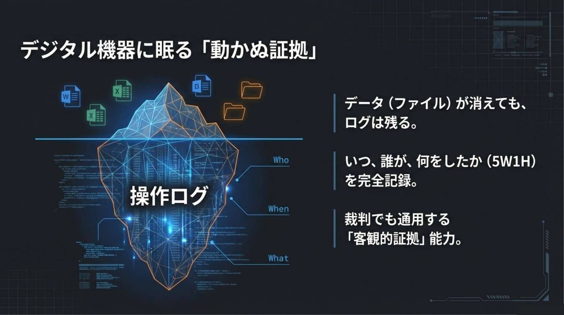ここで、操作ログの重要性が光ります。操作ログが残っていれば、「データ(ファイル)そのもの」が残っていなくても、「いつ、誰が、何をしたか」を調査可能です。特にデジタルフォレンジックの分野では、裁判や損害賠償請求において、客観的な証拠として取り扱うことができます。