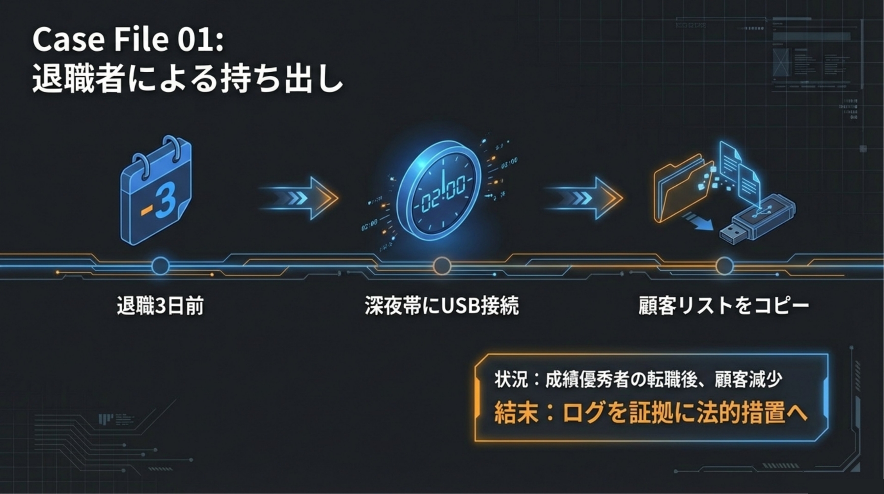 - 操作ログ解析の結果:退職の3日前に、深夜帯に会社PCへUSBメモリを接続した履歴を発見。さらに、特定の顧客フォルダへアクセスし、コピーを実行したログを特定。