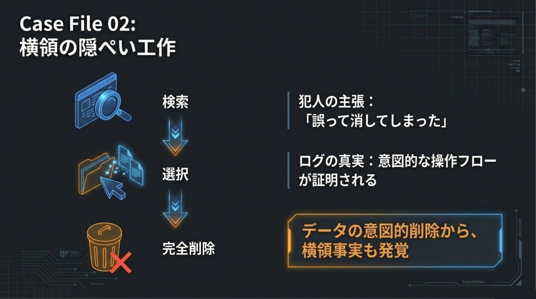 - 操作ログ解析の結果:「誤って削除した」という本人の主張に対し、操作ログ解析で「検索」→「選択」→「完全削除」が発覚。明らかに意図的な操作フローのため、誤操作ではないことを証明。