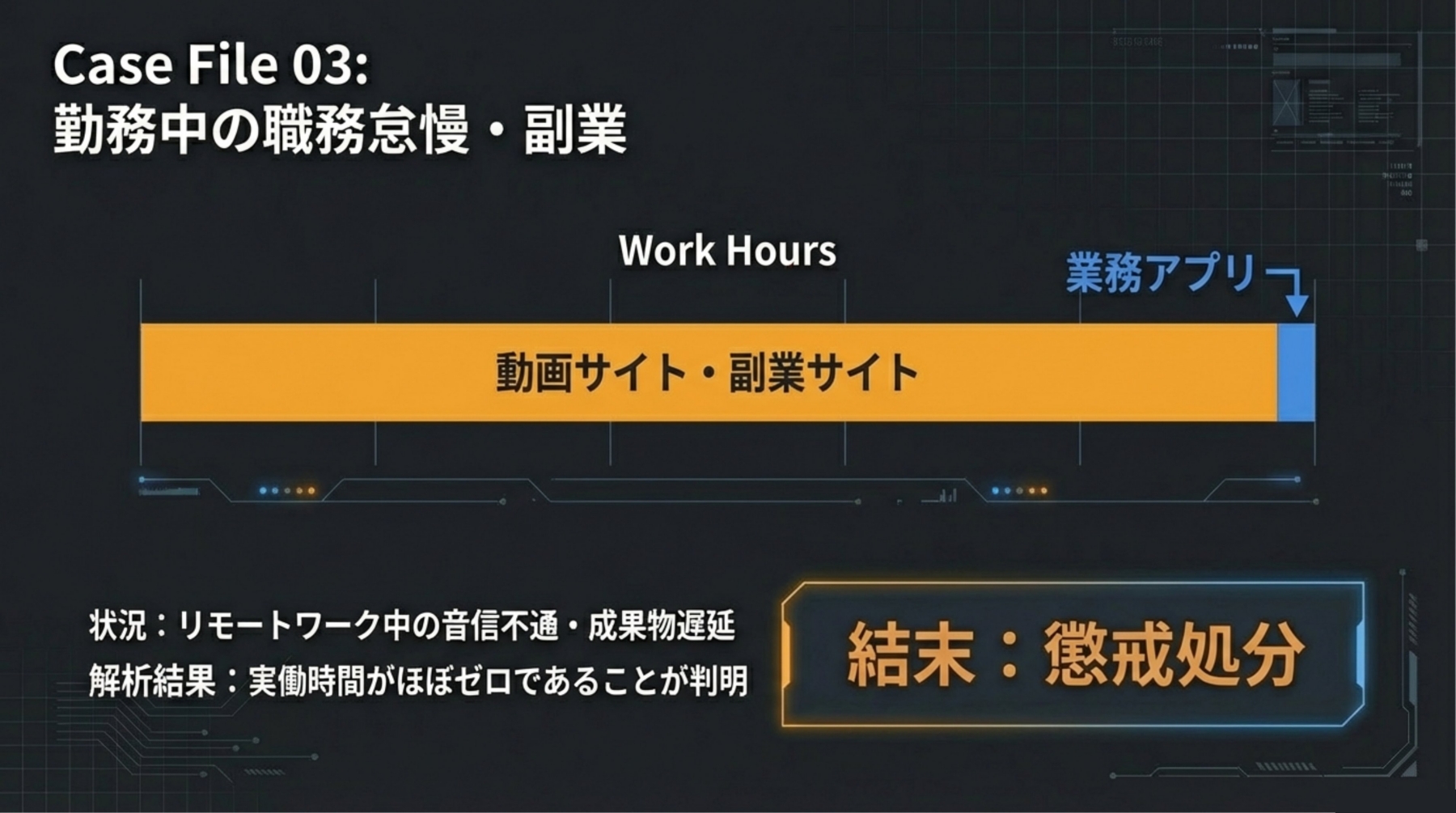 - 操作ログ解析の結果:貸与しているパソコンのWeb閲覧履歴からはYoutubeや副業サイトを発見。操作ログからはほとんど操作されていない実態が発覚。