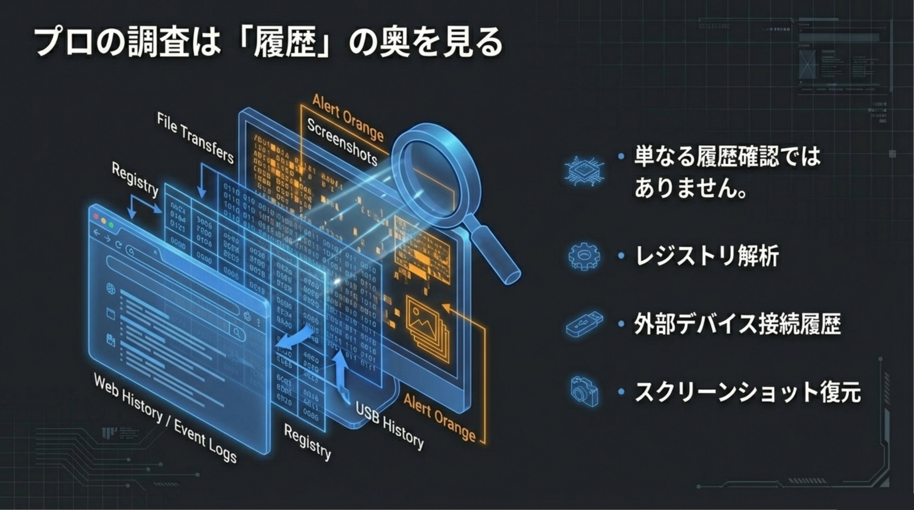 そこで必要となるのがデジタルフォレンジック技術を用いた「操作ログ」の調査です。