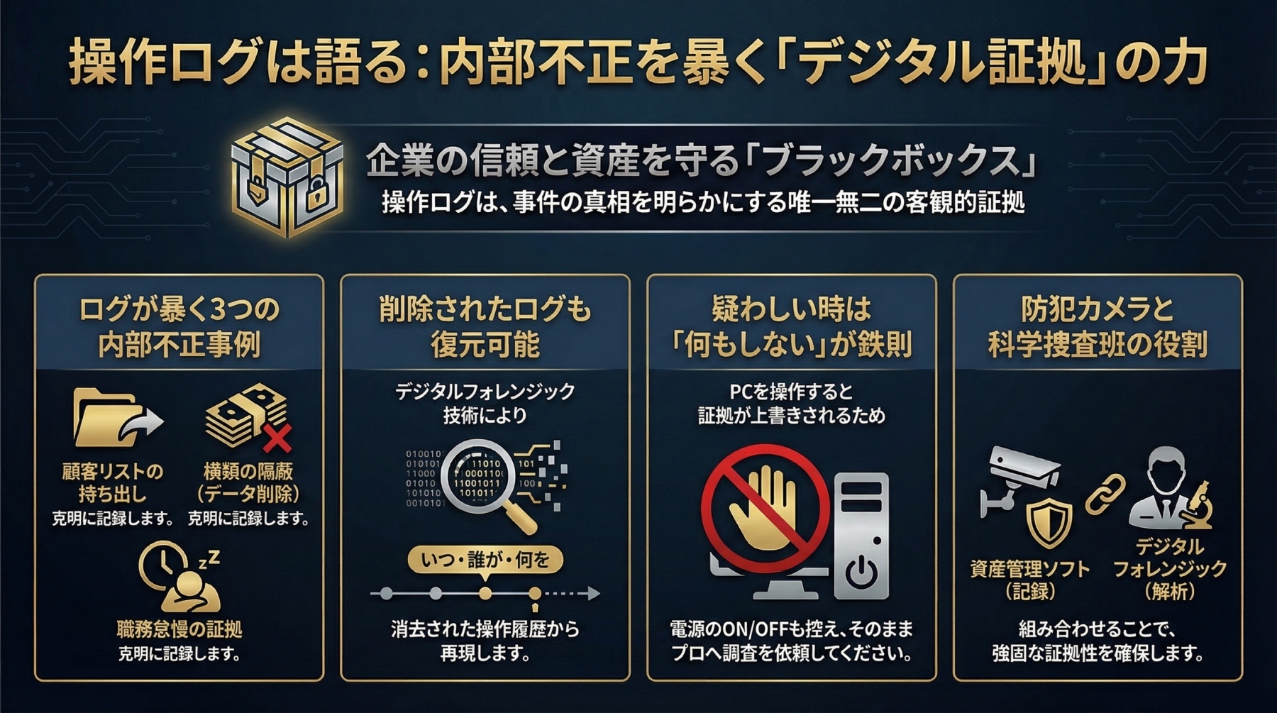 時には顧客や取引先も巻き込むリスクがあります。操作ログの調査によって自社の潔癖を明らかにするためには、「記憶」よりも「記録」が重要です。操作ログは、資産だけでなく「信頼を守る」ためのものでもあります。