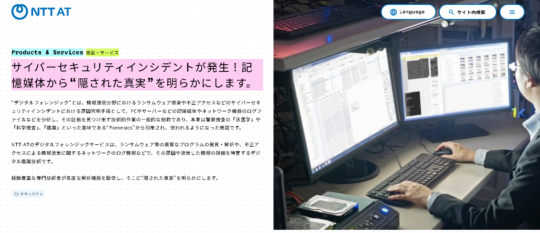 特にインシデント発生時の「初動調査サービス」に特段の強みがあります。調査対象の端末を現地または同社ラボ内で証拠保全し、そのまま初動調査と簡易報告を迅速に実施します。